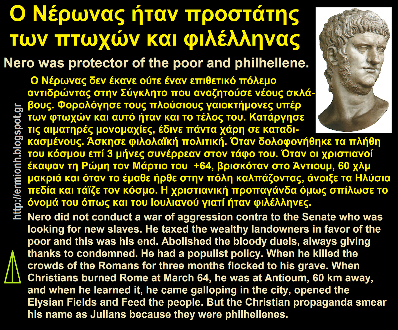 Nero did not conduct a war of aggression contra to the Senate who was looking for new slaves. He taxed the wealthy landowners in favor of the poor and this was his end. Abolished the bloody duels, always giving thanks to condemned. He had a populist policy. When he killed the crowds of the Romans for three months flocked to his grave. When Christians burned Rome at March 64, he was at Antioum, 60 km away, and when he learned it, he came galloping in the city, opened the Elysian Fields and Feed the people.